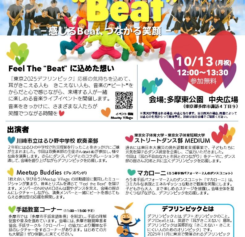 主催は多摩市・東京都多摩障害者スポーツパートナーズ。音楽やダンス、手話を通じて、すべての人が心で“Beat”を感じ、笑顔でつながる――そんな温かな時間を楽しんでみませんか?