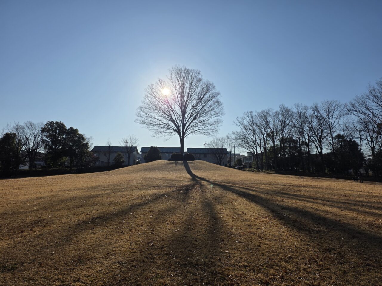 続いて訪れた永山第四公園は、住宅街に溶け込んだ親しみやすい雰囲気が漂います。芝生が広がる丘の上には、空へと力強く枝を伸ばす一本の見事な欅が立っています。なだらかな丘の景観も美しく、ウォーキングの合間に一息つくにはぴったりのスポットです。