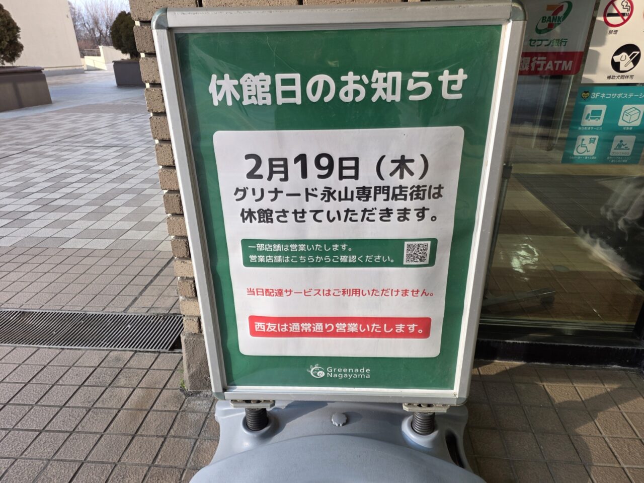 グリナ―ド永山の入り口に、2026年2月19日(木)は休館日である旨の案内が掲示されています。