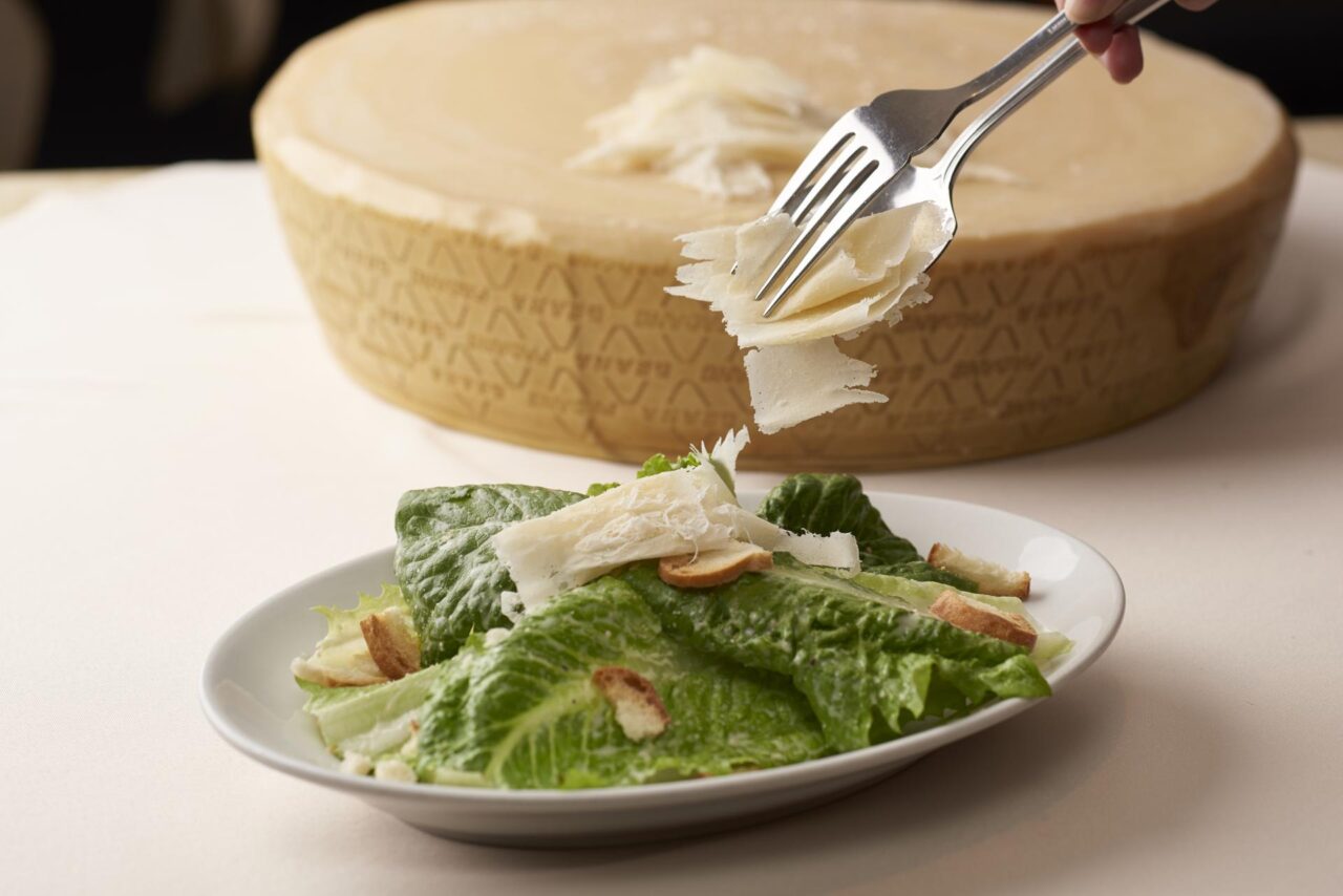 「銀座フランス屋」の名物、削りたてのチーズをたっぷり絡めるシーザーサラダ。