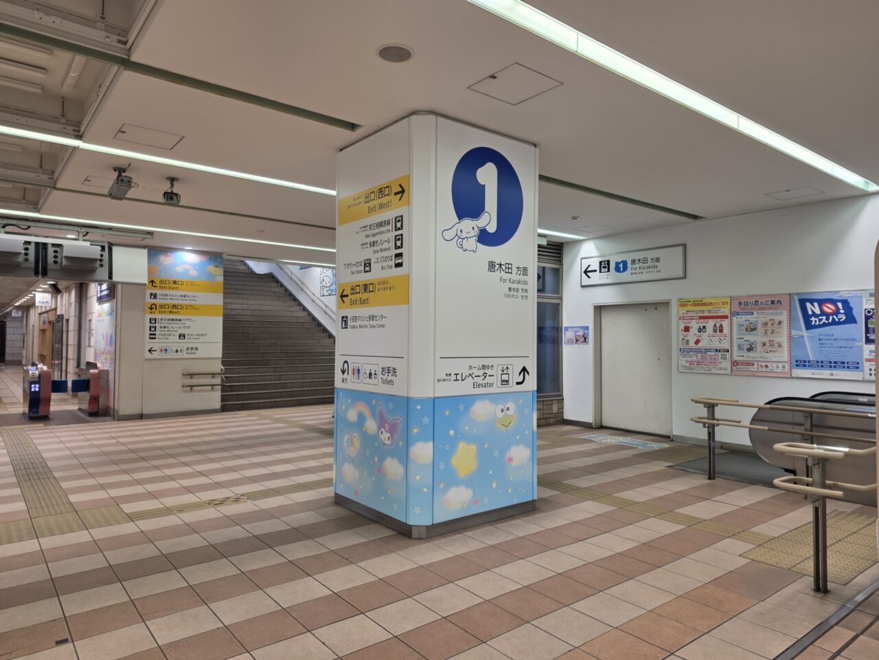 案内表示の柱の足元など、「こんなところにも!」という細かい部分まで新しいデザインが施されています。駅全体が、歩いているだけで楽しくなるような「サンリオの街」らしい演出に包まれていました。