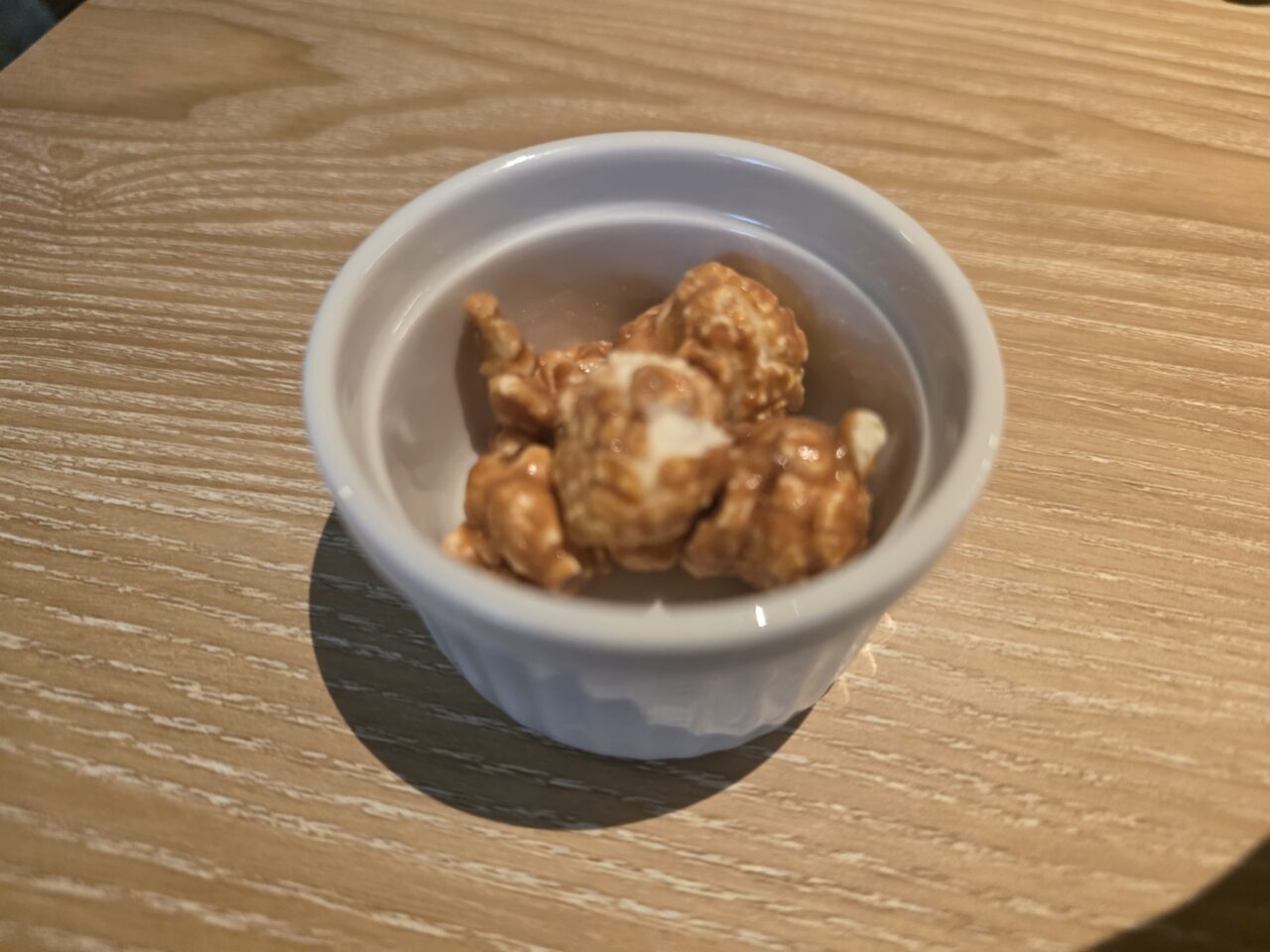 驚いたのは、サービスで添えられたキャラメルポップコーンです。コーヒーの奥深い苦味に、キャラメルの甘みが絶妙なアクセントを添えてくれます。