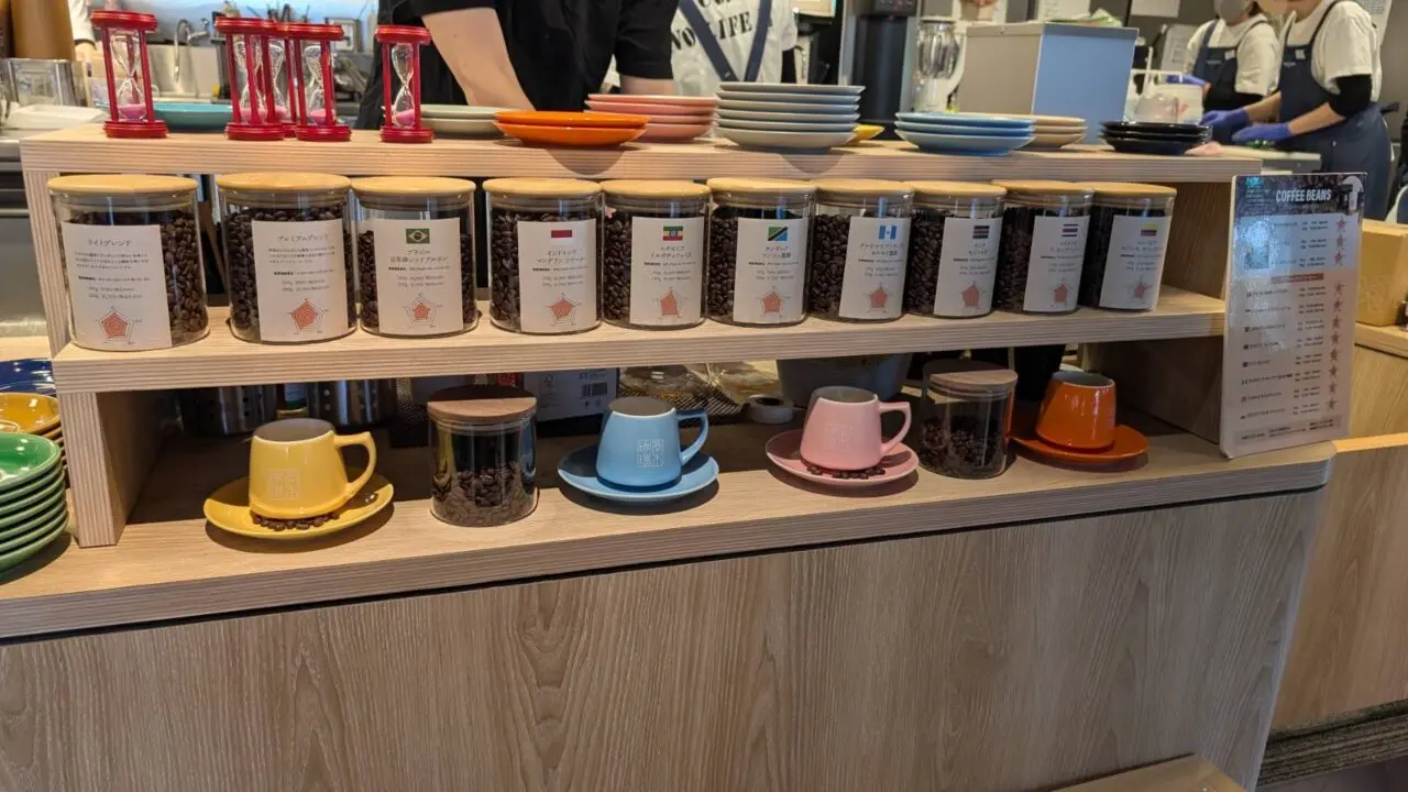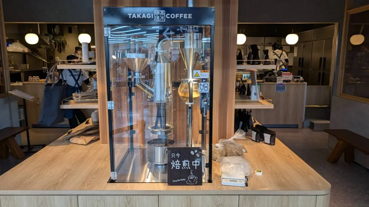 エントランスでまず目を引くのは、美しいガラス製の焙煎機。豆が軽やかに踊り、焙煎されていく様子を間近に眺めることができ、これからの一杯への期待感が高まります。