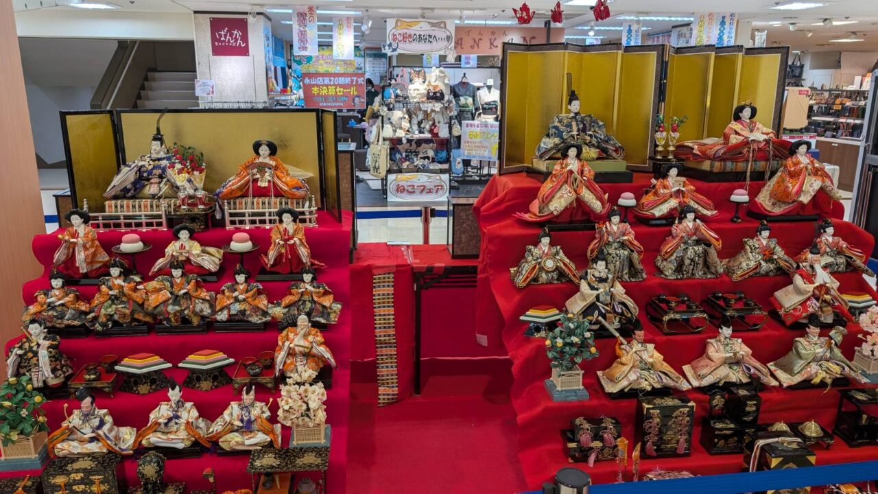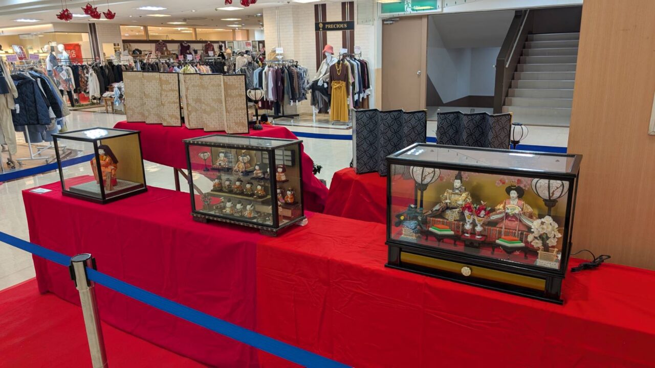 2階の「つばさ広場」には、煌びやかな装束を纏ったひな人形が並び、訪れる買い物客の目を楽しませています。会場には、伝統的な多段飾りのひな壇から、ケースに入った精巧な人形まで、バリエーション豊かな展示が用意されています。