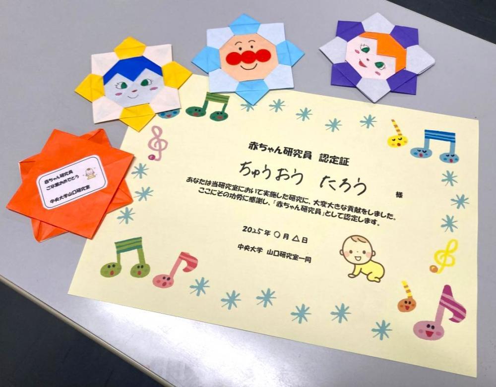 始めてお越しいただいた赤ちゃんには「赤ちゃん研究員認定証」が渡されます。また卒業の際にはスタッフ手作りの「記念メダル」がもらえます。