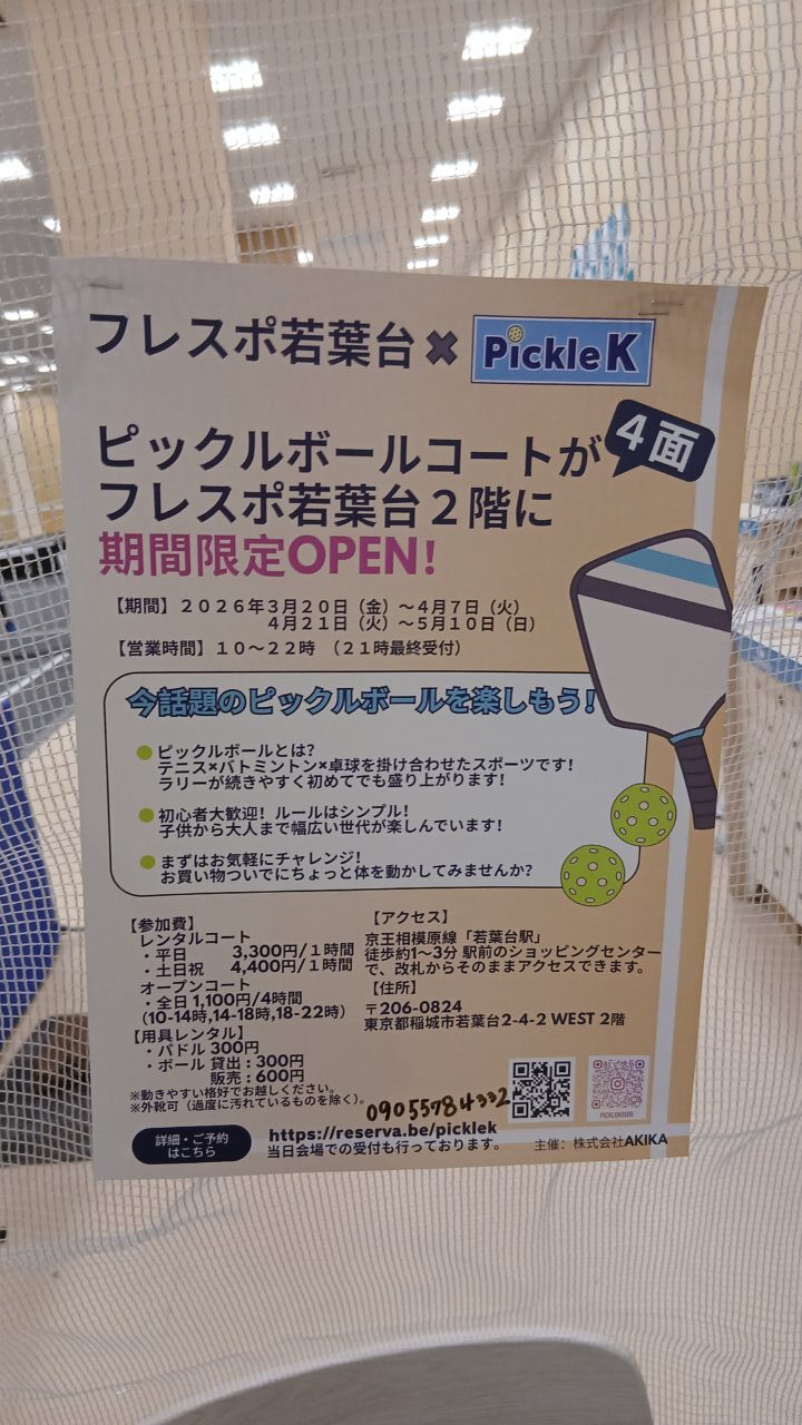 商業施設「フレスポ若葉台」ダイソーの隣に、アメリカ発祥で話題のスポーツ「ピックルボール」の専用コートが期間限定でオープンしています!掲示されているチラシによると、開催日は2026年3月20日~4月7日ならびに4月21日~5月10日のようです。