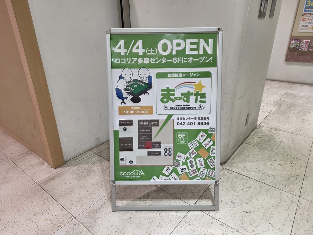 2026年4月4日に、飲食店やヘアサロンが出店しているフロアであるココリア多摩センター6階に、雀荘「禁煙健康マージャンまーすた」がオープンしました。東京都内では3店舗目の出店となります。
