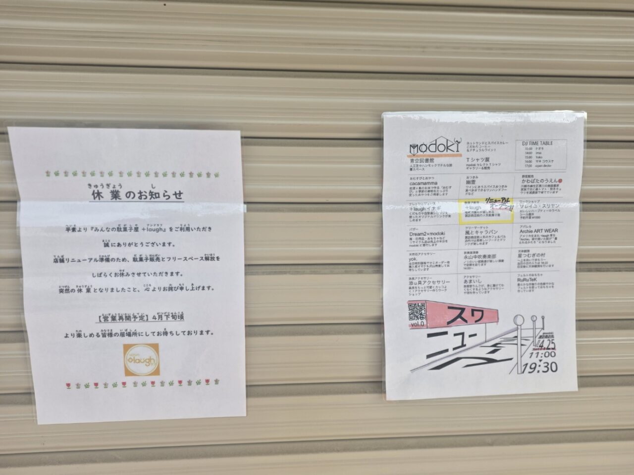 諏訪商店街の駄菓子屋&フリースペース併設の重症児者向け通所事業所、+laugh(アンドラフ)が2026年4月25日にリニューアルオープンすることが判明しました。店舗の入り口には、リニューアルのため一時休業していること、リニューアルオープンの詳細を知らせる掲示物が貼ってあります。